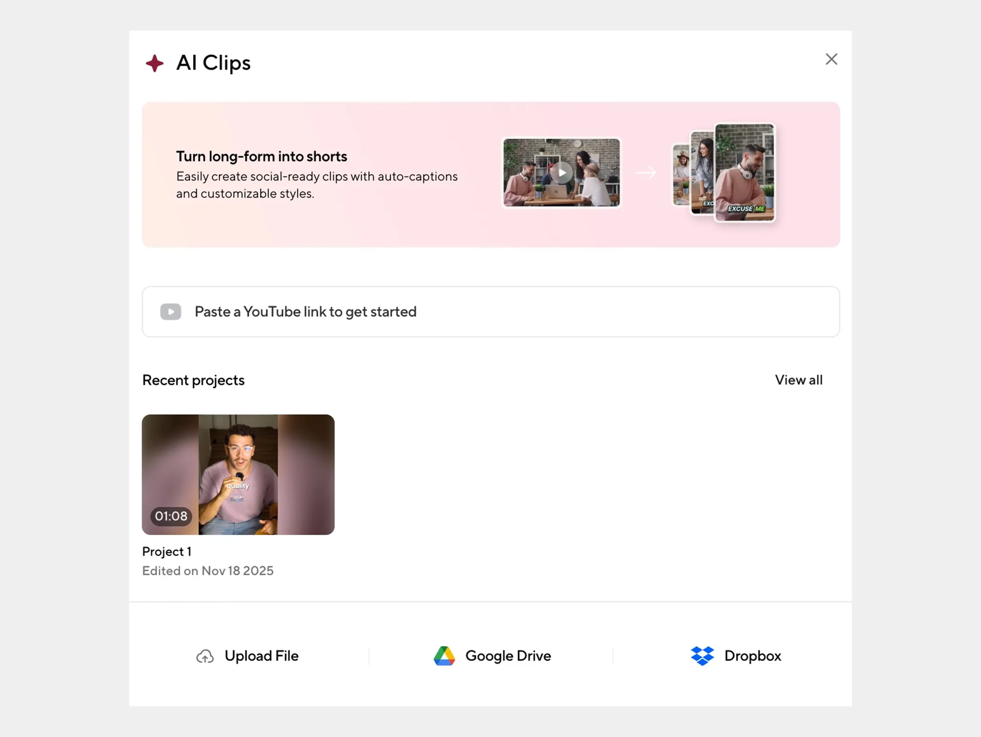 Once your video is downloaded and saved to your device, you’re ready for the fun part: turning that long video into short, shareable moments. Next up, we’ll walk through how to upload your YouTube video into the AI clips tool and get everything ready for clipping.