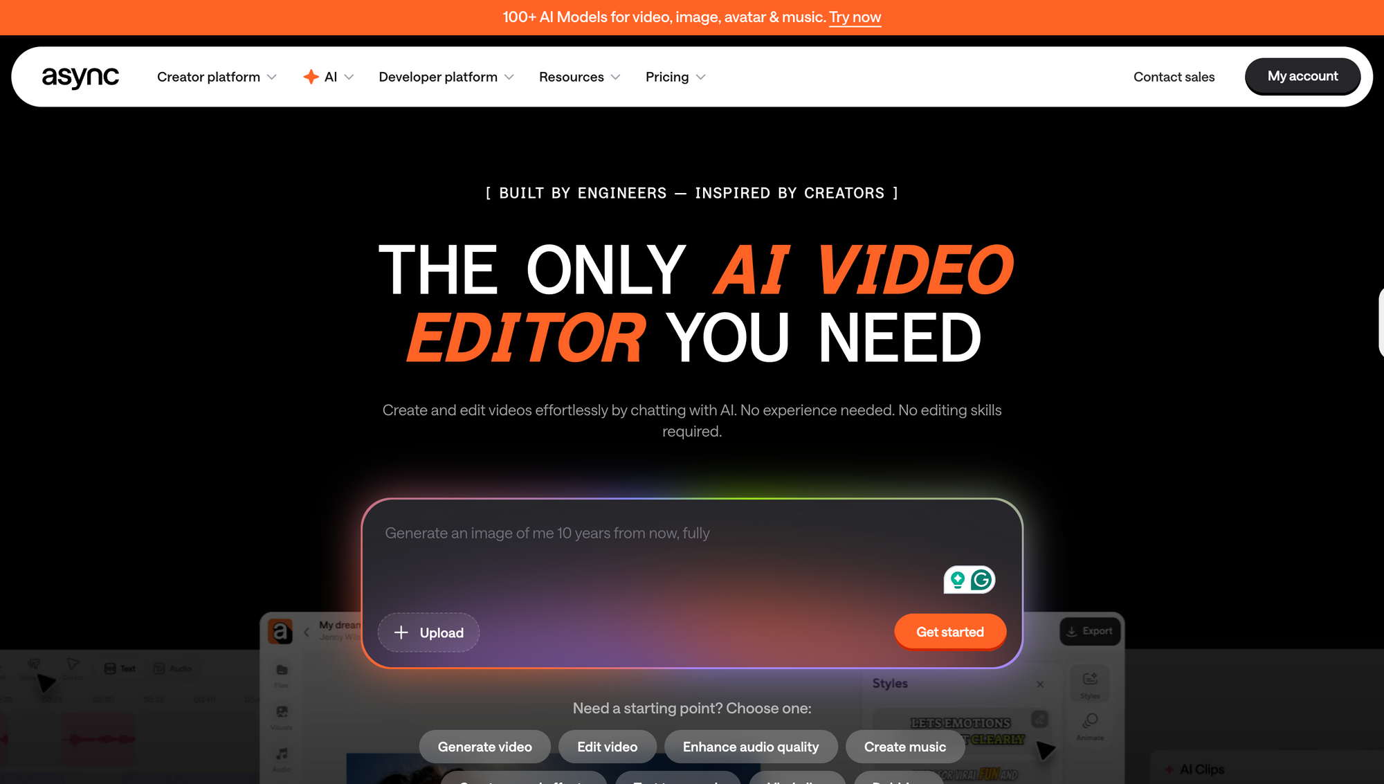 - Access to 100+ AI models inside the editor, so you can generate visuals, videos, and more without leaving the platform