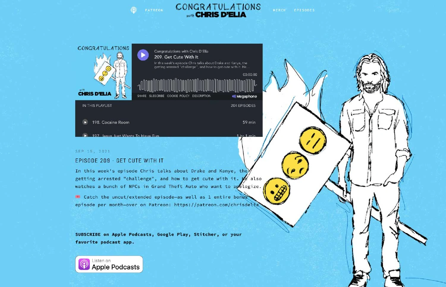 Take a look at Chris D’elia’s Congratulations podcast homepage. A simple glimpse at it makes it clear that there’s no way it’s a news podcast. The rough sketch of Chris D’elia and the light blue background suggest that the show will be a lot of fun.