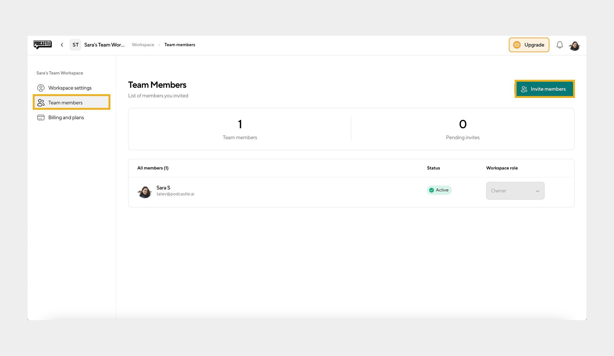 2. Navigate to the Workspace settings and select Team members from the dropdown menu.