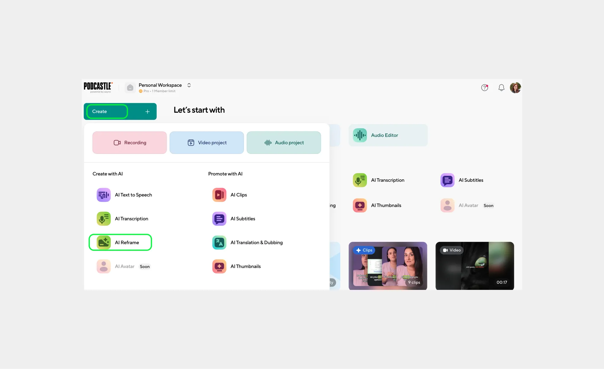 Log in to your Podcastle.ai account and click Create, then choose AI Reframe. This opens the dedicated workspace for converting horizontal to vertical video using AI, without manual cropping or keyframing.