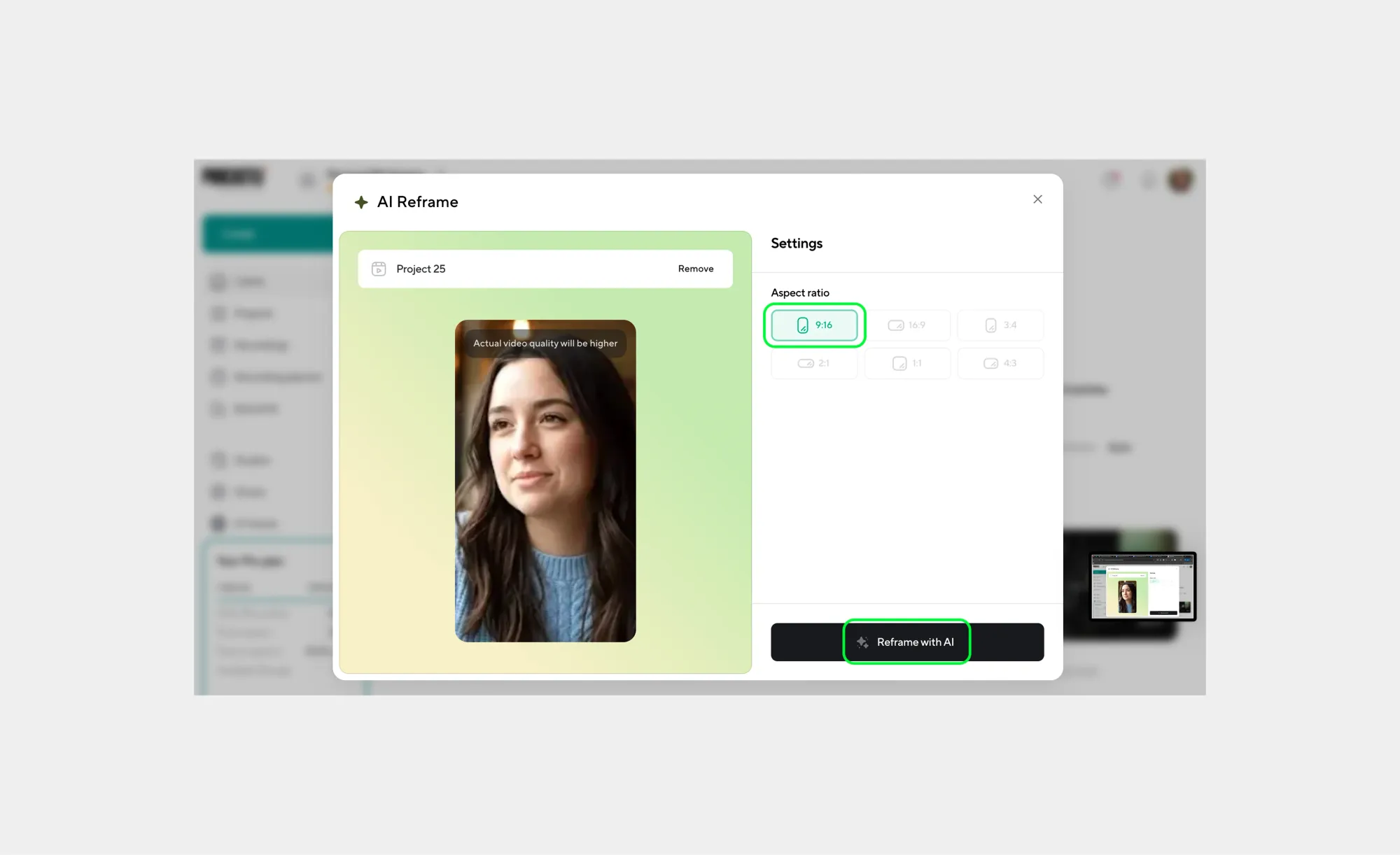 This is the core step. Use AI reframe to automatically adapt the video to the new format. Instead of guessing crops, the AI tracks motion, speakers, and focal points, making it easy to reframe videos with AI accurately and consistently.