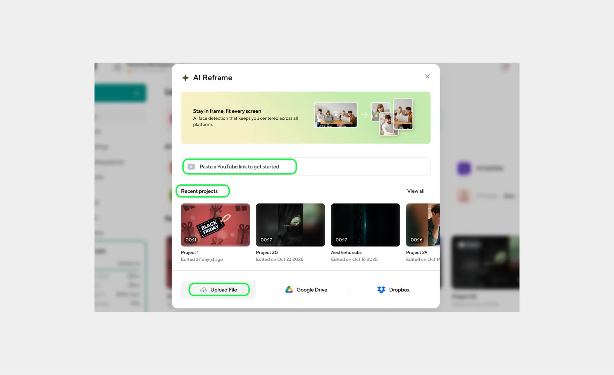 Upload a video from your device, select one from your existing Podcastle projects, or paste a YouTube link. AI Reframe works directly with your original footage, so there’s no need to pre-edit or resize beforehand.