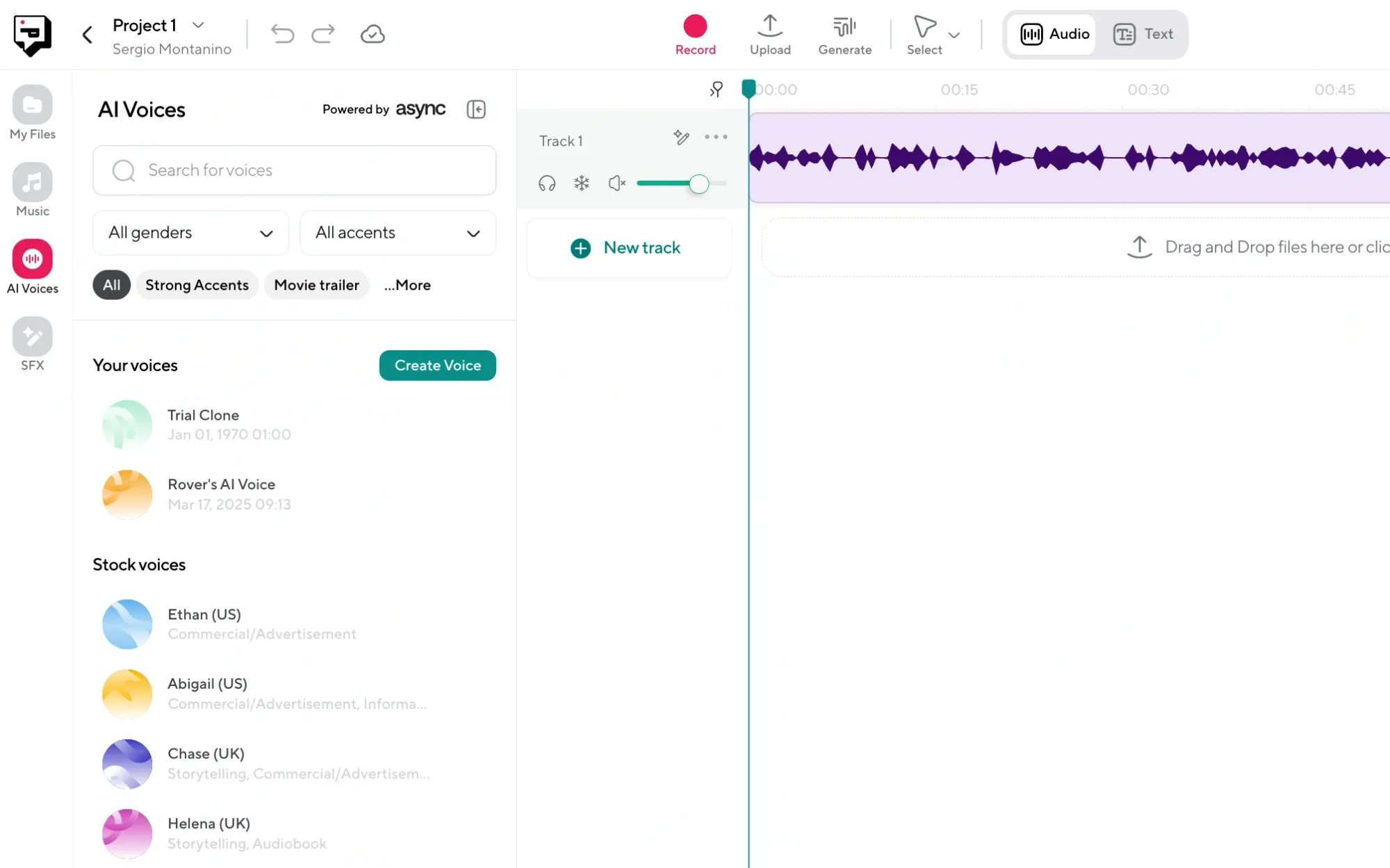 With Podcastle, you can create and drop a voiceover straight into your video or audio timeline in just a few minutes. You pick a voice, type your script, preview it, and drop it in. Then, if you want, you can take it further by adding music, adjusting pacing, or building out the rest of your project with stock footage and other AI tools.
