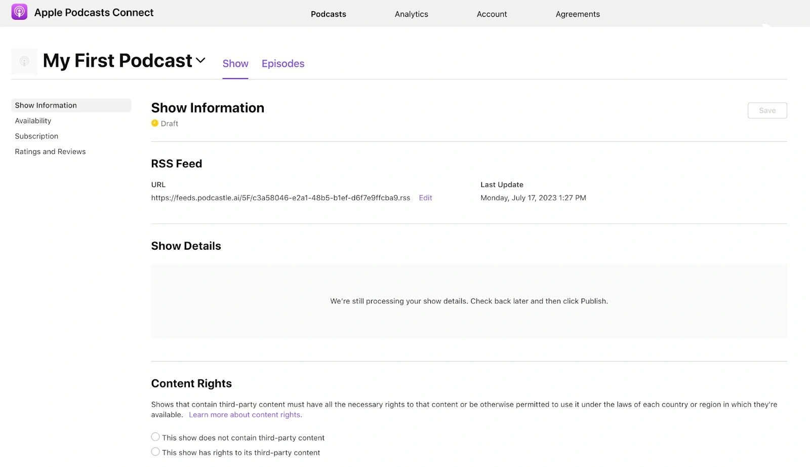 Keep in mind that the Apple Podcasts upload might take a couple of days. Once you've reviewed and submitted your show details, Apple Podcasts will review your submission for compliance with their guidelines. This process usually takes a few days. Be patient and refrain from making any significant changes to your podcast during this period.