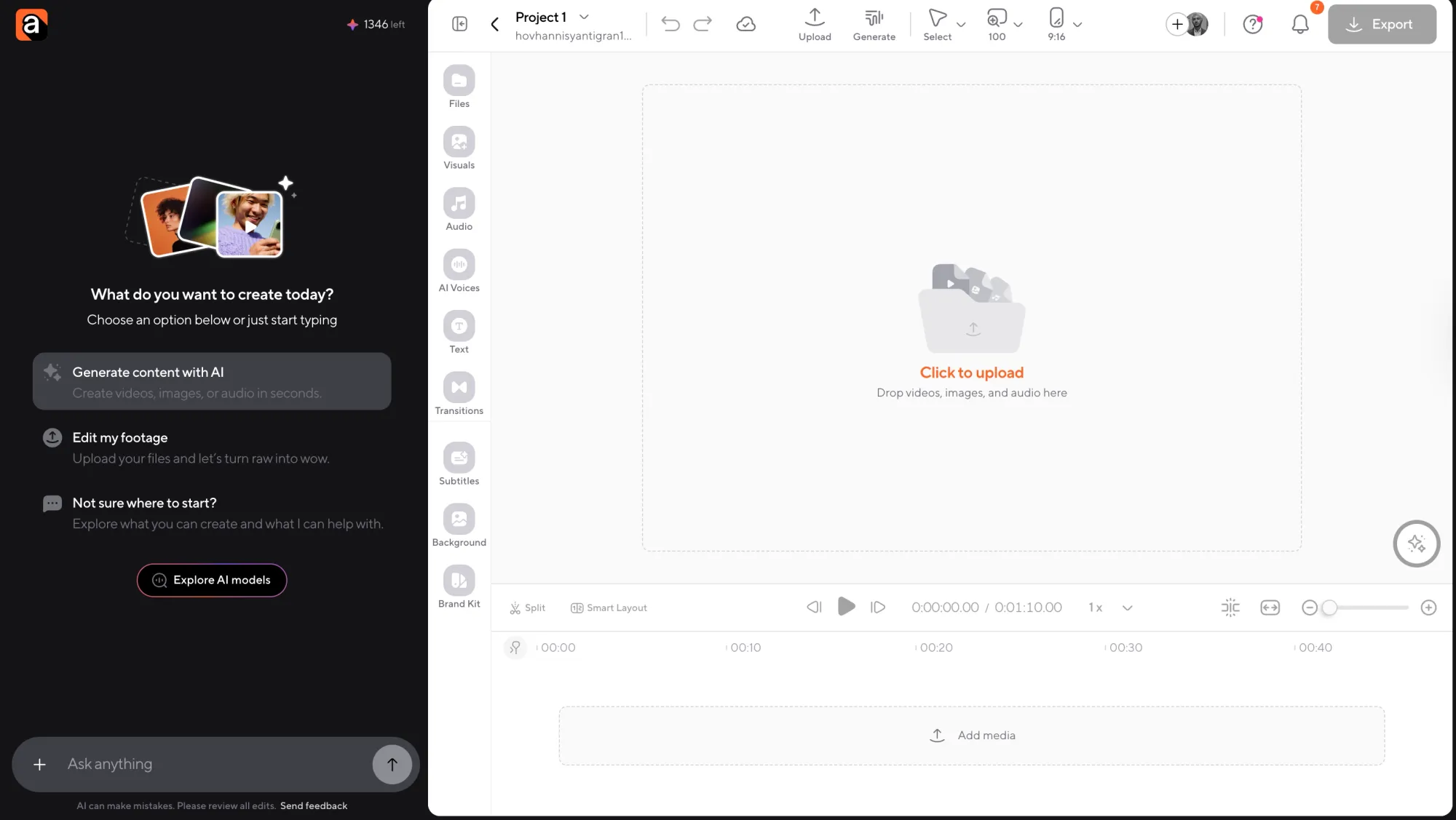 Bring your generated assets into the timeline, make quick edits if needed, and export your reel when it’s ready.