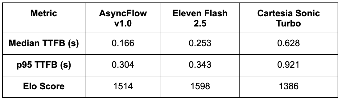 • AsyncFlow ranked a close second, with its performance remaining remarkably consistent and minimal robotic artifacts even under aggressive streaming latency. Considering its ~34% faster TTFB and lower serving cost, AsyncFlow offers an excellent quality-to-latency ratio.