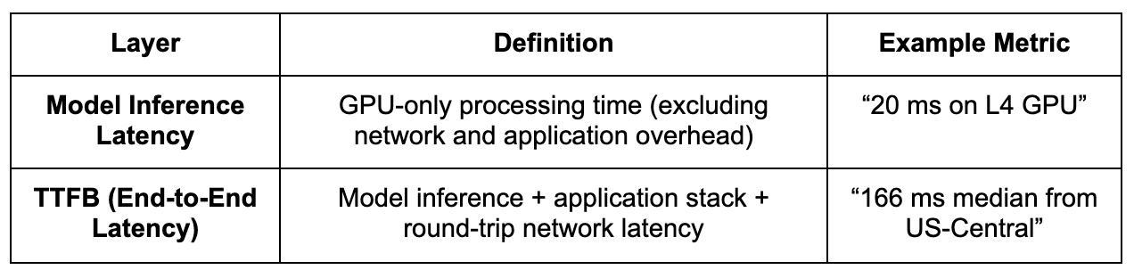 • Model-level latency - time spent on GPU inference only, excluding networking and application overhead.