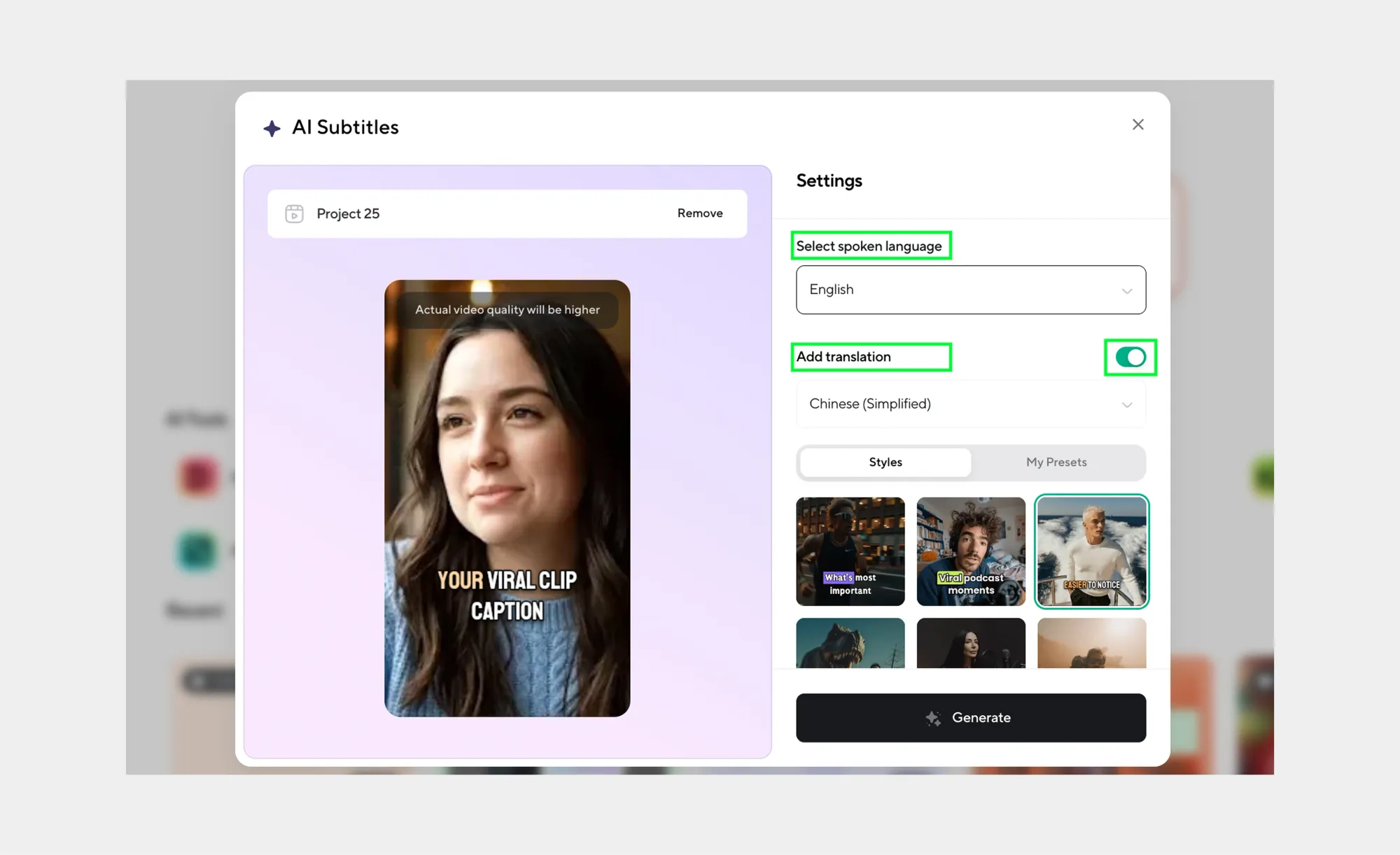 Pick a caption style and toggle translation to instantly localize your subtitles for a global audience.