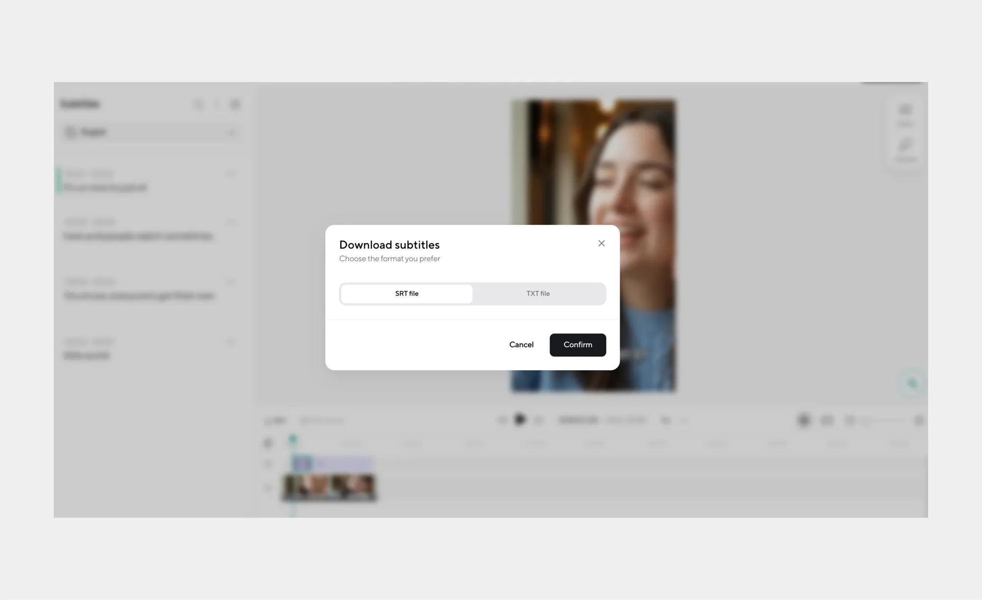 Download your video with subtitles or export captions separately as SRT or TXT files. And that’s it! You have now successfully added AI subtitles to your video!