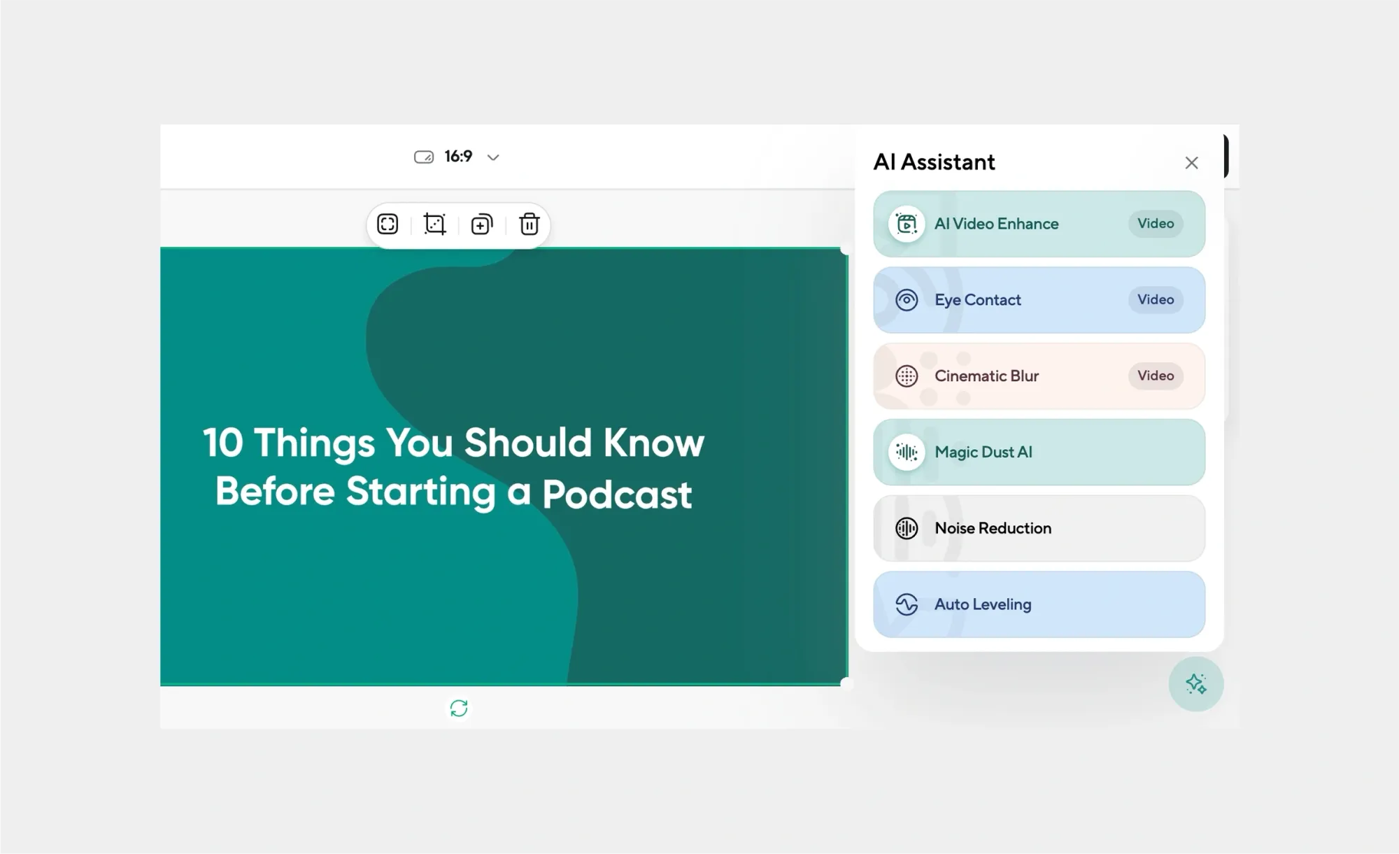 Podcastle’s built-in AI helps you polish your ASMR with ease. You can clean up background noise, enhance the sound quality, and even remove filler words automatically if you’re doing any soft speaking or whispering. For video, you can swap in a calmer background or keep things feeling consistent with color and lighting. You can also layer in a soft AI voiceover to create guided content or mix with your own recording.