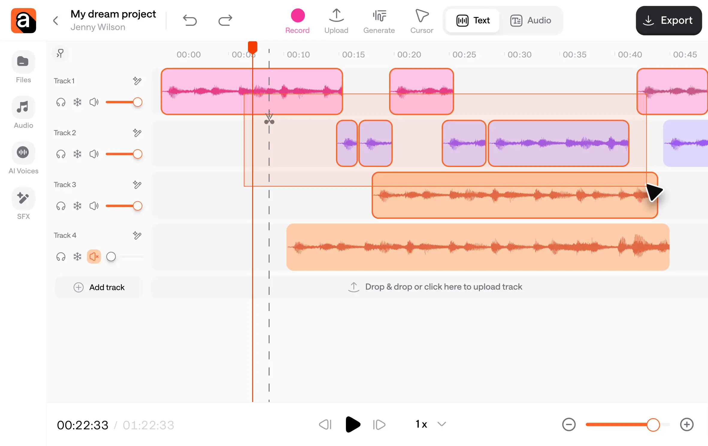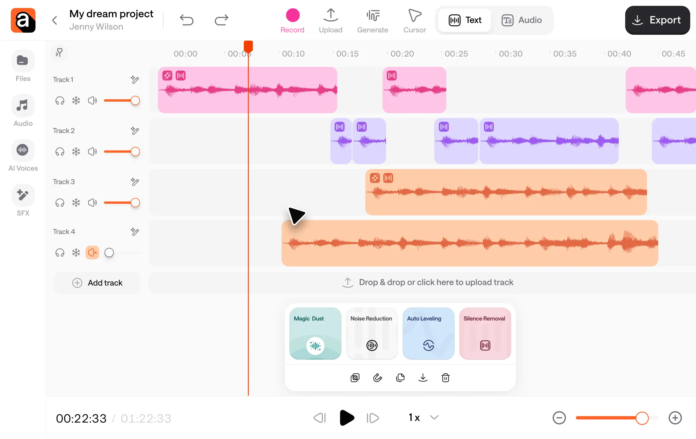 Audacity is great for advanced users, but many creators want something simpler and faster. Our free audio editor gives you an easier workflow with built-in AI tools for cleaning up and enhancing your audio automatically.