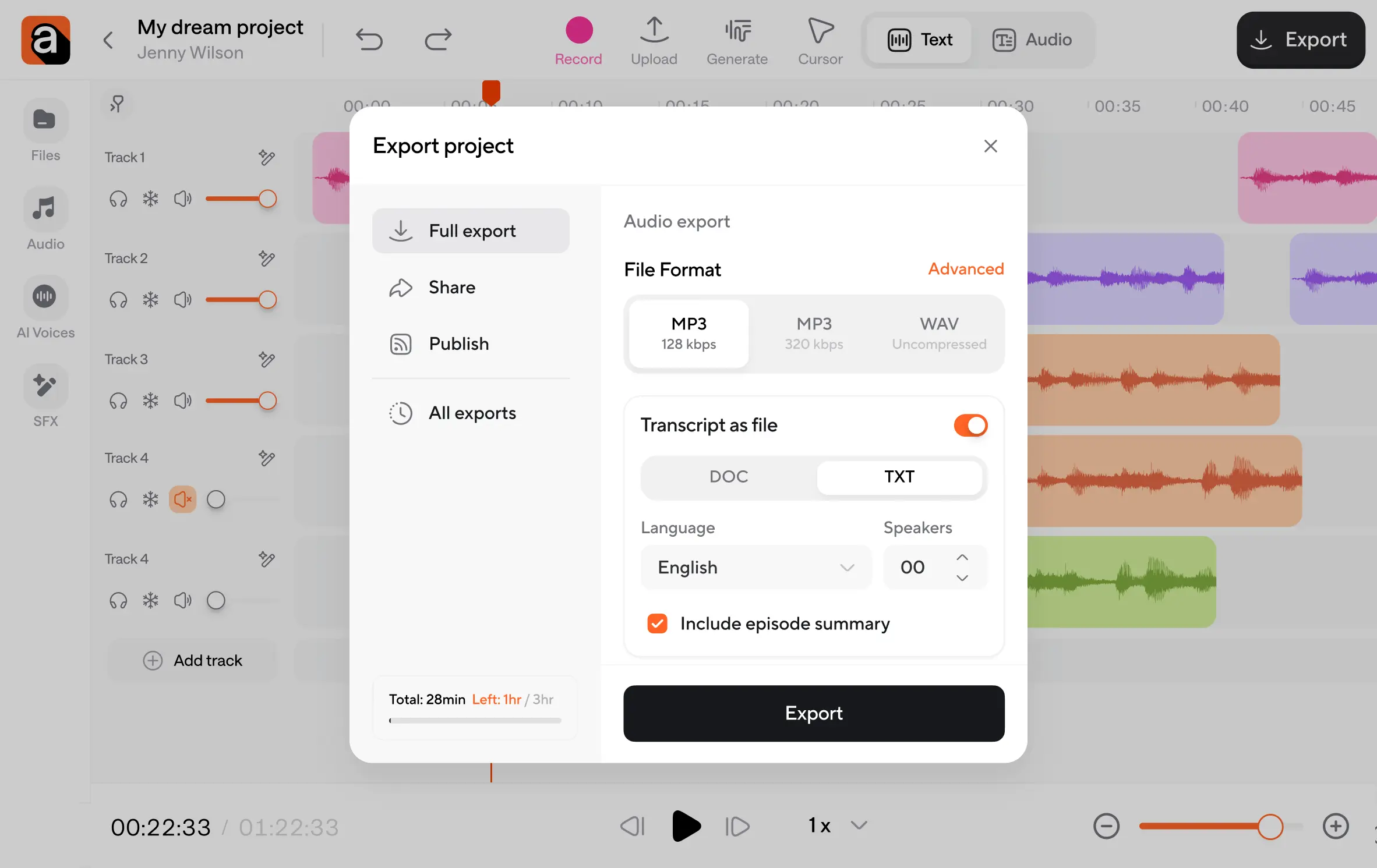 Yes. Our online AI audio editor makes the process simple and beginner-friendly. You can edit by deleting words from an automatic transcript instead of cutting waveforms manually. This speeds up the process and ensures a polished result.
